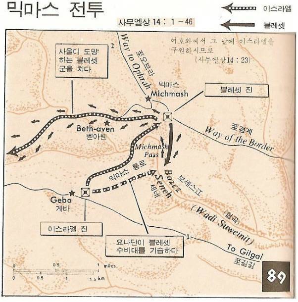 사울 왕 군대의 지휘관으로 임명된 요나단은 블레셋 사람들이 믹마스까지 쳐들어왔을때 블레셋 진영으로 들어가 그들을 교란시켰고, 사울은 군대를 이끌고 블레셋으로 쳐들어가 큰 승리를 거두게 되었다.(14:6~23)