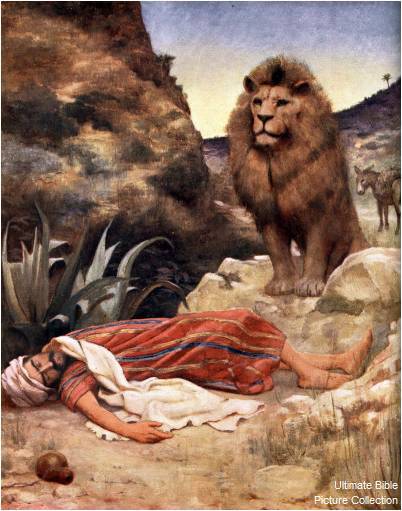 - 이에 그 사람이 가더니 사자가 길에서 그를 만나 물어 죽이매 그의 시체가 길에 버린 바 되니 나귀는 그 곁에 서 있고 사자도 그 시체 곁에 서 있더라
